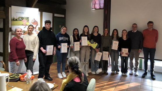 Eine Gruppe von Schülerinnen stehen zusammen mit zwei Männern und einer Frau vor Ausstelungswänden. Sie halten selbstgestaltete Ausstellungsplakate in den Händen.