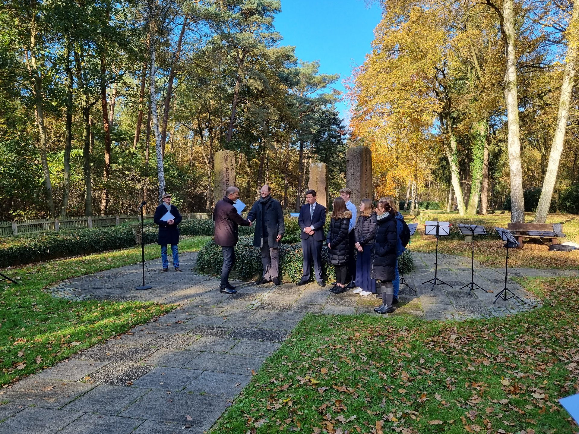Bei sonnigen Herbstwetter und unter Teilnahme zahlreicher Gäste fand am 2. November 2021 eine lang geplante schulische Gedenkveranstaltung auf der Kriegsgräberstätte Sandbostel statt, bei der drei regionale Schulen für ihr langjähriges Engagement auf dem Lagerfriedhof mit einer Urkunde des Landesvorsitzenden des Volksbundes, Kultusminister Grant Hendrik Tonne, geehrt wurden.