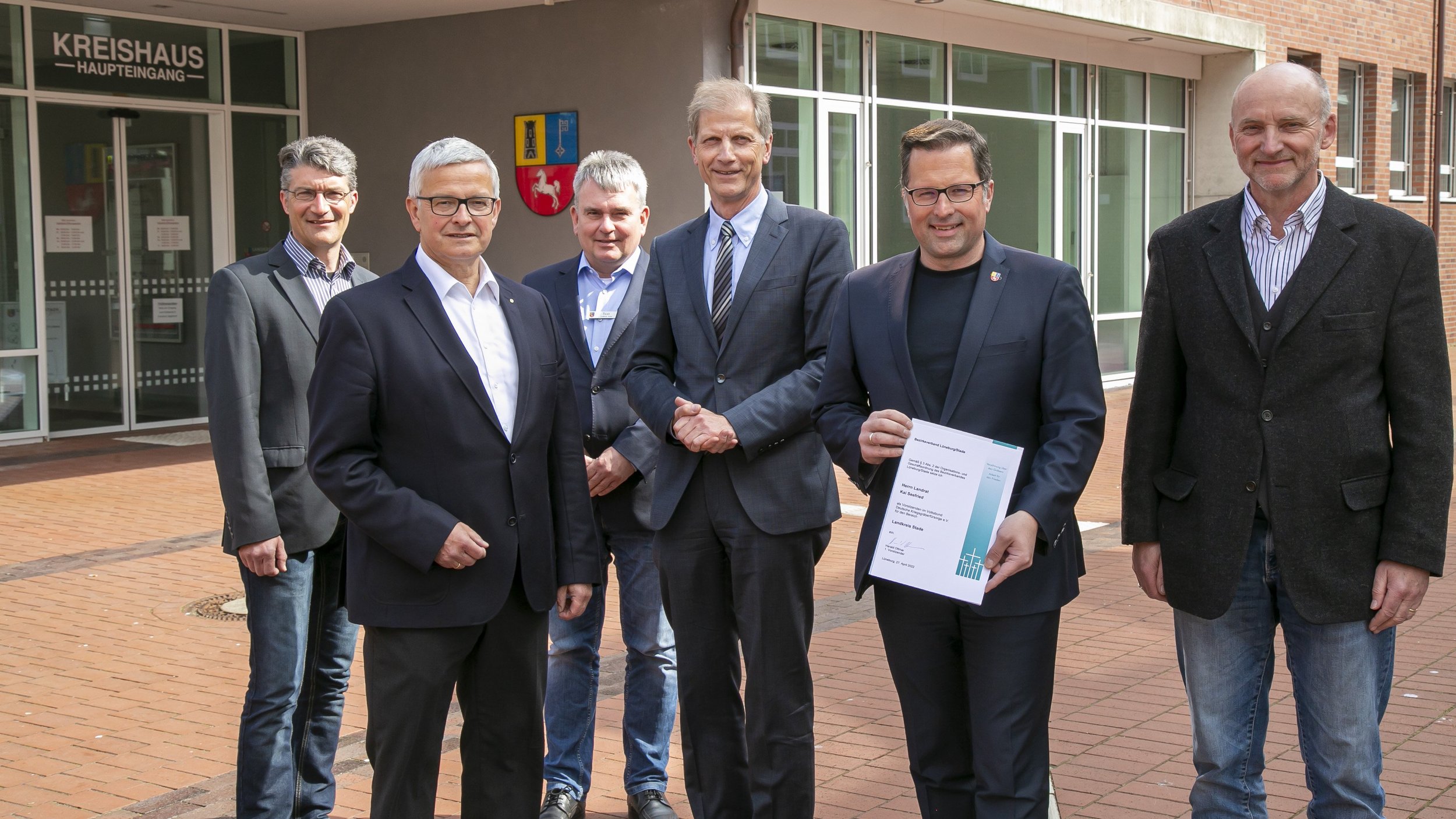 Amtsübergabe beim Kreisvorsitz des Volksbundes Deutsche Kriegsgräberfürsorge (von links): Jan Effinger (Bezirksgeschäftsführer Bezirksverband Lüneburg/Stade), Landrat a. D. Michael Roesberg, Kai-Ulrich Baak (Kreisgeschäftsführer), Harald Ottmar (Bezirksvorsitzender im Bezirksverband Lüneburg/Stade), Landrat und neuer Kreisvorsitzender des Volksbundes Kai Seefried sowie Karl-Friedrich Boese (Bildungsreferent im Bezirksverband Lüneburg/Stade). Foto: Landkreis Stade/Christian Schmidt