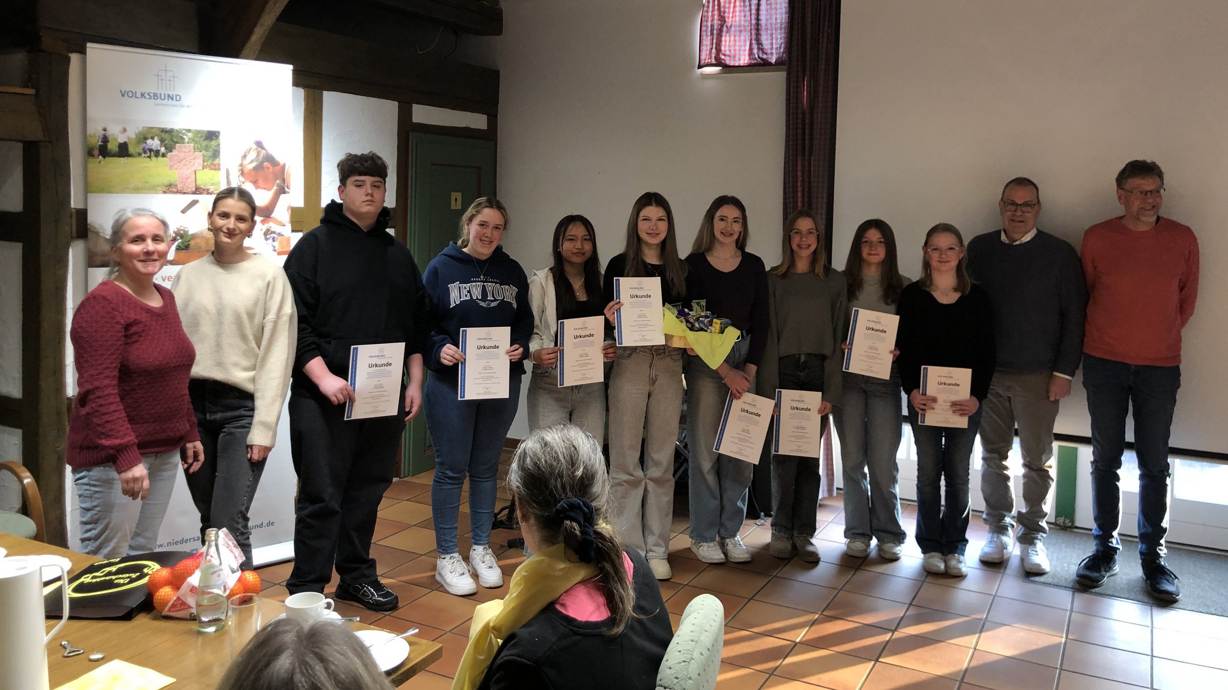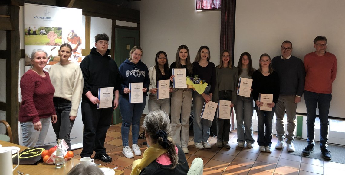 Mit dabei waren auch Schülerinnen und Schüler der Oberschule Lamstedt, die während der Veranstaltung noch einmal ihren Beitrag präsentierten, den sie im Gottesdienst zur zentralen Gedenkfeier des Kreisverbandes zum Volkstrauertag 2024 aufgeführt hatten. Dafür und für ihre Beteiligung an der Haus- und Straßensammlung wurden sie im Rahmen der Veranstaltung mit Urkunden ausgezeichnet.