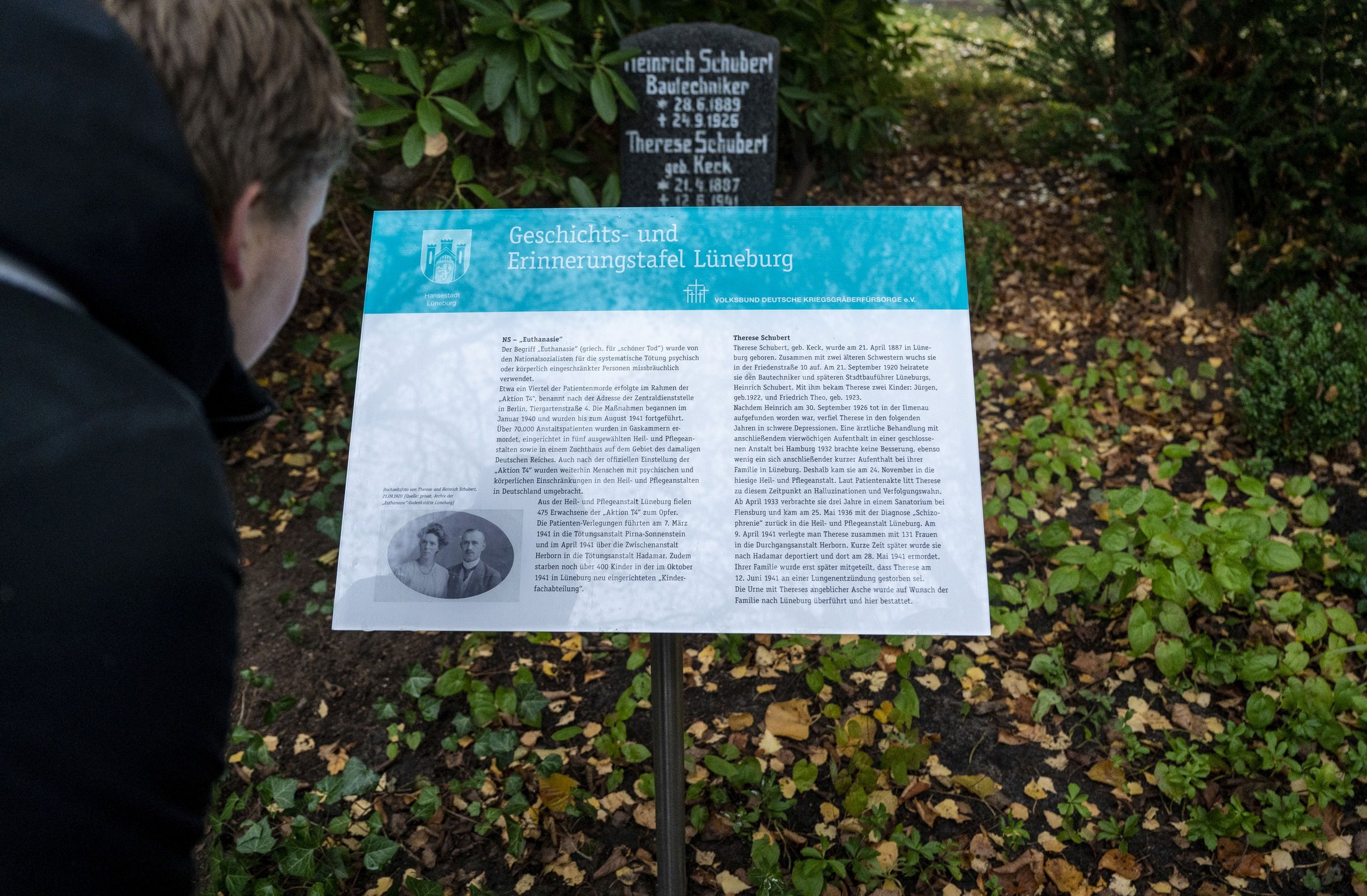 Schülerinnen der Wilhelm-Raabe-Schule die sich in einer AG mit Leben und Sterben von Therese Schubert auseinandersetzt hatten berichteten während der Gedenkstunde über die 1887 in Lüneburg geborene Frau. Diese erkrankte nach dem ungeklärten Tod ihres Mannes an Depressionen und begann Stimmen zu hören. Daraufhin kam sie erstmals im November 1932 in die Heil- und Pflegeanstalt Lüneburg. Am 9. April 1941 wurde sie, gemeinsam mit 131 Patienten, in die Durchgangsanstalt Herborn deportiert. Sie verstarb am 28. Mai 1941 in der Tötungsanstalt Hadamar. 70.000 Menschen mit geistiger oder körperlicher Behinderung wurden Opfer der NS-Gewaltherrschaft –Therese Schubert war eine von ihnen.
